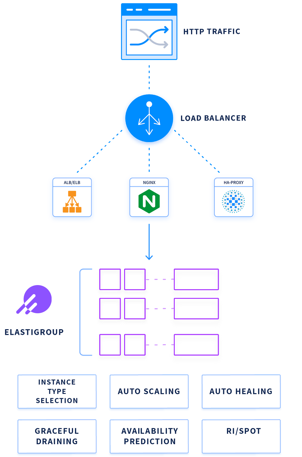 Elastigroup seamlessly integrates with several AWS services, such as ALB/ELB, ASG, Beanstalk, Route53, Opsworks, CodeDeploy, Chef, and EMR.